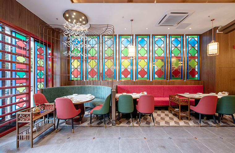 品深餐飲設計在策劃設計蘩樓深圳首店-寶安南路店的時候,就提出“建一面品牌網紅墻,悄悄走進小姐姐的心房”的網紅空間設計主張。所以我們在蘩樓寶安南路店一樓大廳上二樓最顯眼的位置做了一個大大的蘩樓主招牌,使用經典的西關花窗造型,在燈光照耀下具有濃烈的西關風情,引來了很多拍攝分享,很好地將品牌宣傳出去了。