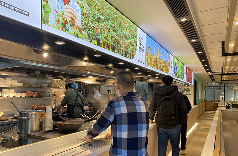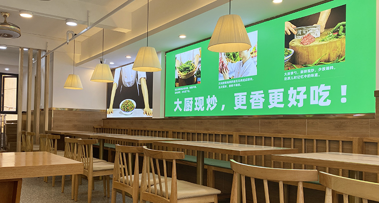 為了使門店效果最大化,在立面的墻面上可以做一些精美的廣告燈箱畫面,超薄軟膜燈箱,用一些高精度的精美大圖,內容或與品類相關,或與品牌文化有聯系,或是表現菜品核心特色。讓顧客在用餐之余,還能欣賞并閱讀我們的產品。