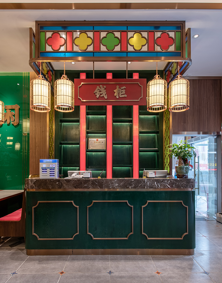 中,我們將廣式花窗大面積使用在正面形象,進門口,包房隔斷等,形成了強烈的視覺沖擊力,具有鮮明的品牌感。