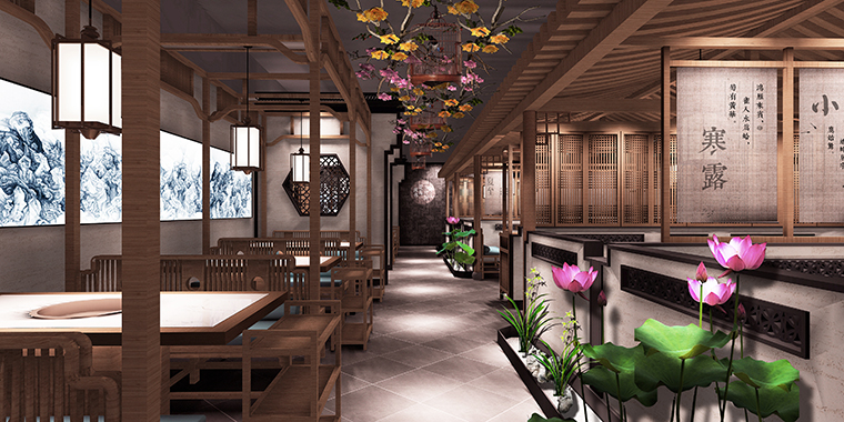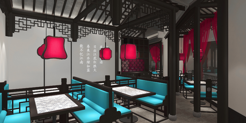 如:品深餐飲設計過的二小姐的店,從蘇杭古典園林中獲取靈感元素,將江南園林中“連廊”的建筑形式引入項目空間中,并與不同的座椅形式完美組合,營造出室外廊下的用餐體驗場景化的設計。將江南的粉墻黛瓦,飛檐翹角,通過剪影化的設計手法,成為空間立面的裝飾造型元素。長形的沙發座椅靠背設計借鑒江南建筑的欄桿造型(又稱美人靠),與背景的建筑剪影形成形式的完美統一。并將江南的水色山光,山嵐煙云,通過淡墨山水的形式移植進餐廳的墻面,作為整個餐廳的背景,讓人仿佛置身江南的自然天地之間用餐,清新淡雅,心曠神怡!整個效果極為雅致,在整個商場中吸睛效果最好,門店運營業績優良,坪效長期名列前茅