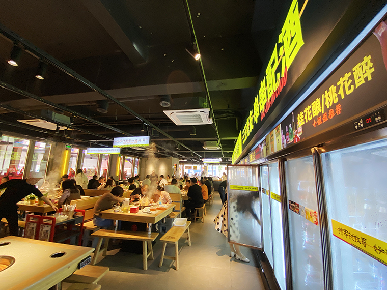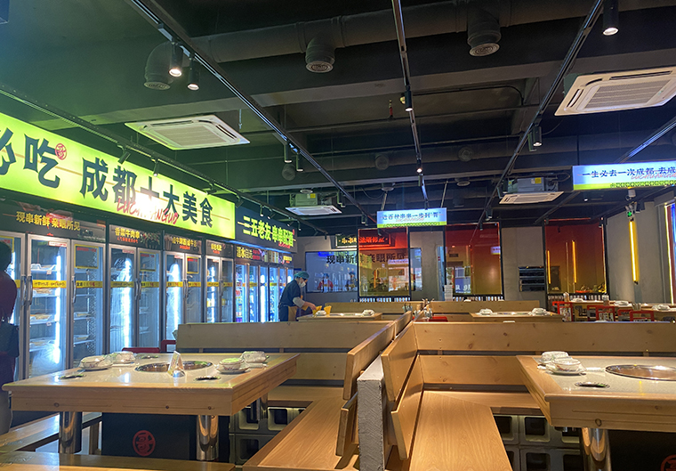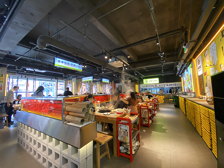 串串香火鍋的用餐特點比較獨特,類似自助火鍋。顧客自己到冰柜取串串,拿飲品,喜歡什么就拿什么。因此,在門店功能設計方面,取串串的冰柜是客流最密集的地方,需要給顧客展示出串串品類特別多的優勢。